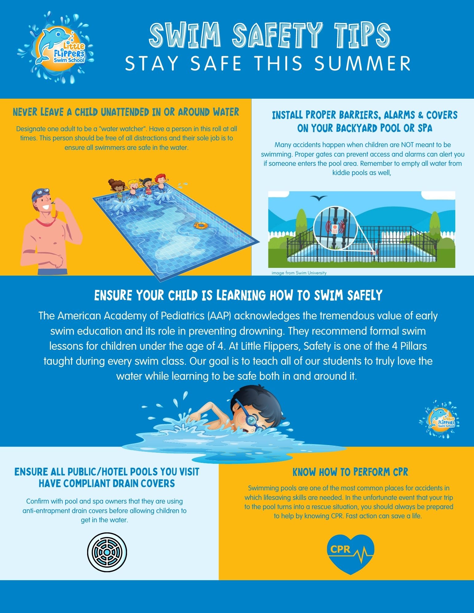 At Little Flippers Swim School, we focus on swim safety year round. Swim safety has been our company’s foundation and remains a very important part of each and every lesson plan we create.